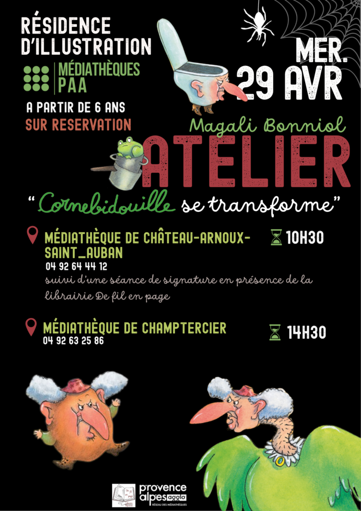 le mercredi 29 avril 2026, Magali Bonniol animera l’atelier « Cornebidouille se transforme » à la bibliothèque de Champtercier. Sur réservation en appelant le 04 92 63 25 86 ou 04 92 31 10 37.